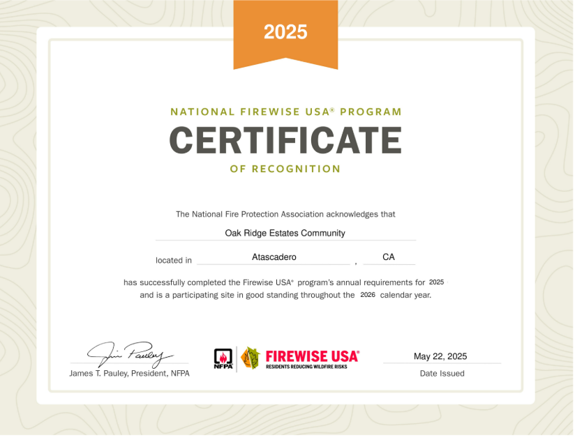Oak Ridge Estates, nestled on California’s Central Coast, is proud to be a nationally recognized Firewise USA® site as of May 22, 2025. This honor reflects our community’s dedication to wildfire preparedness, risk reduction, and active resident involvement. Through strategic vegetation management, neighborhood-wide fuel-reduction events, and ongoing public education, we’re strengthening resilience against the unique wildfire challenges of the Central Coast’s landscapes.